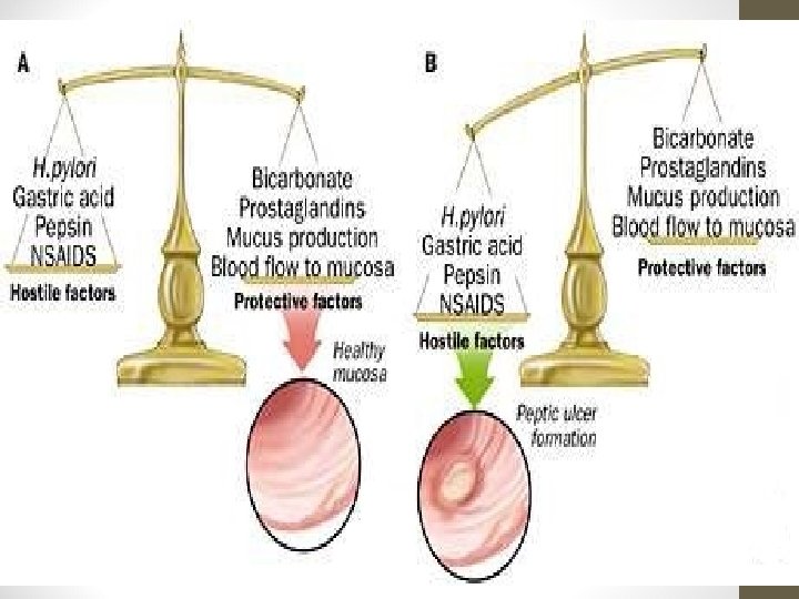 Etiology Helicobacter pylori infection(90%) Drugs - anti-inflammatory(NSAIDs) & Corticosteroids Hyperacidity - e. g. . Zollinger Ellison syndrome. Food habits(Spicy food, diet poor in vitamins, smoking and alcohol) • Diabetes may increase your risk of having H. pylori • Lifestyle factors, including chronic stress, coffee drinking, may make more susceptible to damage from NSAIDs or H. pylori if one is a carrier of this organism. But these factors do not cause an ulcer on their own. • Diseases associated with an increased risk of PUD include cirrhosis, chronic obstructive pulmonary disease, renal failure, and organ transplantation. • •