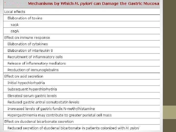 • The organism also elaborate phospholipases that damage surface epithelial cells. • Bacterial proteases and phospholipases break down the glycoprotein-lipid complexes in gastric mucus, thus weakening 1 st line mucosal defense • It also enhances gastric acid secretion and impairs duodenal bicarbonate production thus reducing p. H in duodenum • Several H. pylori are immunogenic, and they cause activation of both T cells and B cells • Thromboembolic occlusion of surface capillaries is promoted by bacterial platelet-activating factor.