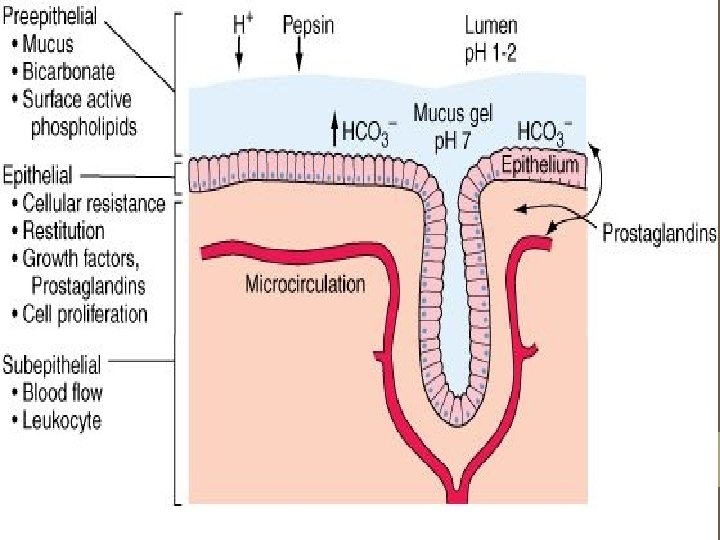 Gastric Physiology Gastroduodenal Mucosal Defense: The mucosal defense system can be divided as a threelevel barrier 1. Preepithelial 2. Epithelial 3. Subepithelial