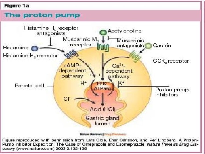 PGE 2 + Histamine + ACh M 3 Ranitidine Gastrin _ Proglumide _ Misoprostol _ PGE receptor Adenyl cyclase ATP Ca++ + + H 2 + c. AMP + Gastrin receptor Ca++ + Protein Kinase (Activated) K+ + H+ K _ Omeprazole Proton pump Gastric acid Parietal cell Lumen of stomach _ Antacid
