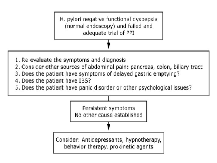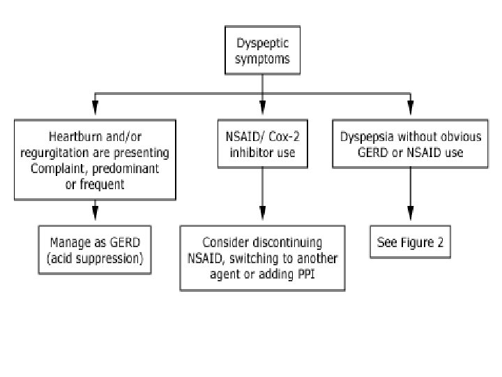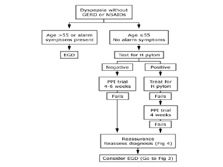 Dyspeptic patients younger than 50 without alarm features q Should be test for H. pylori Ø If positive : H. pylori eradication Ø If negative : Øshort trial (4 -8 weeks) PPI or Ø EGD q NSAID stopped, if possible.