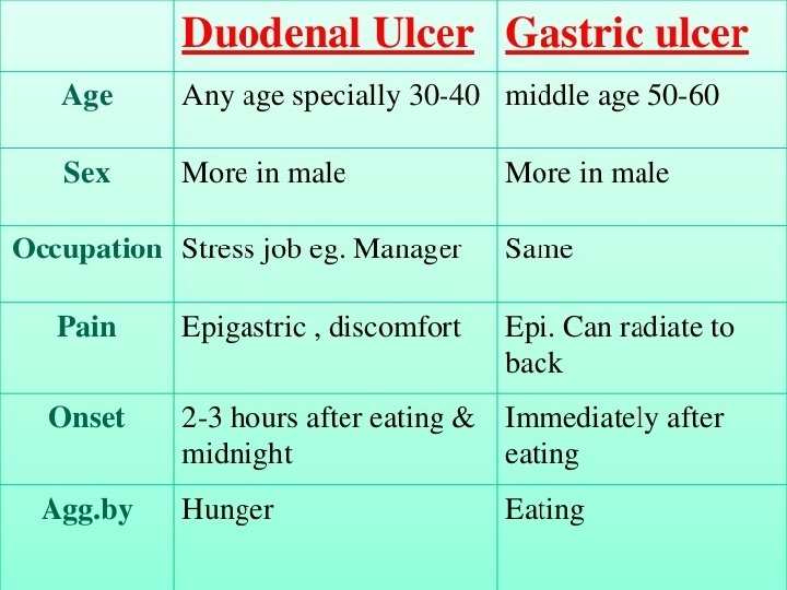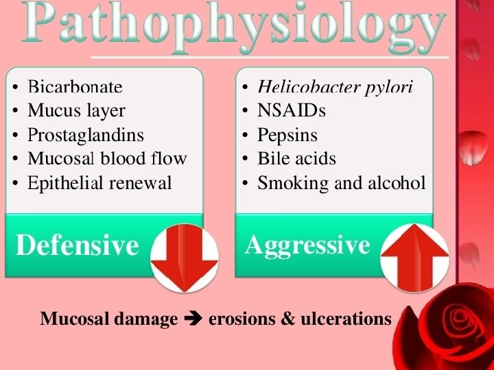 Causes of peptic ulcers �Helicobacter pylori infection (80 -95%) �Nonsteroidal anti-inflammatory drug (NSAID) use. �Severe stress (surgery, trauma, ICU) �Injury or death of mucosa producing cells �Hypersecretory states; hypercalcemia Genetics, blood group O