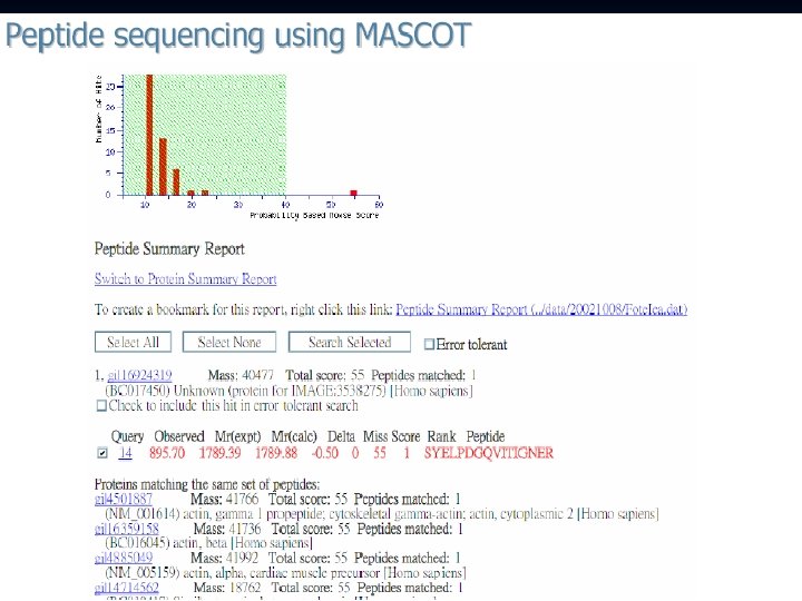 What you need for peptide mass mapping n Peptide mass spectrum n Protein Database n n Gen. Bank, Swiss-Prot, db. EST, etc. Search engines n Mas. Cot, Prospector, Sequest, etc.