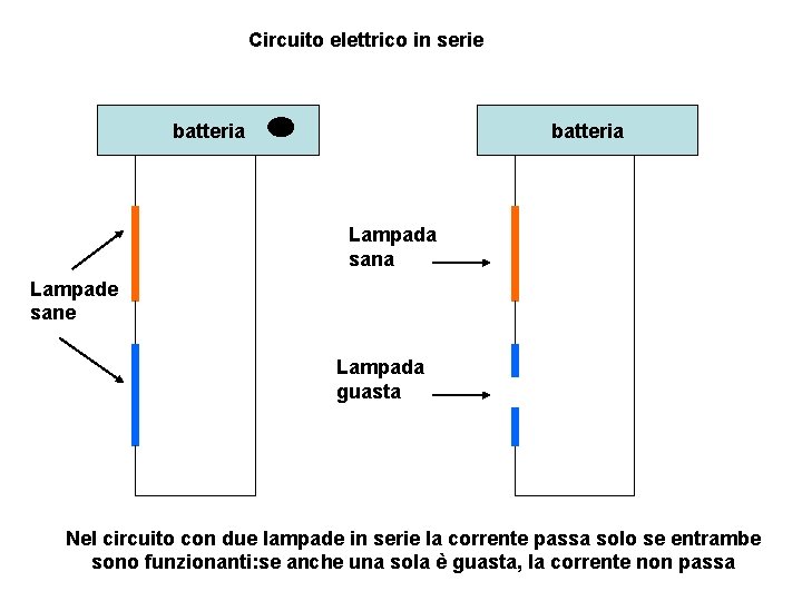 Circuito elettrico in serie batteria Lampada sana Lampade sane Lampada guasta Nel circuito con due lampade in serie la corrente passa solo se entrambe sono funzionanti: se anche una sola è guasta, la corrente non passa