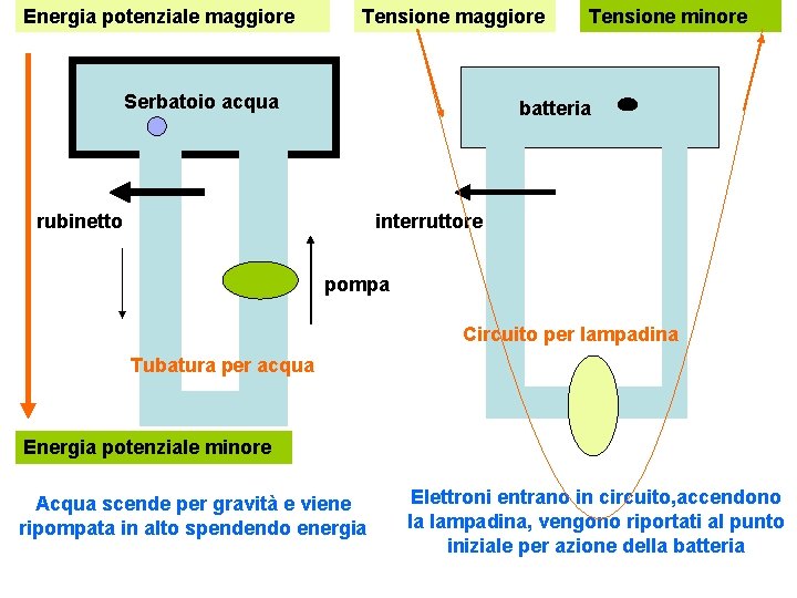 Energia potenziale maggiore Tensione maggiore Serbatoio acqua Tensione minore batteria rubinetto interruttore pompa Circuito per lampadina Tubatura per acqua Energia potenziale minore Acqua scende per gravità e viene ripompata in alto spendendo energia Elettroni entrano in circuito, accendono la lampadina, vengono riportati al punto iniziale per azione della batteria