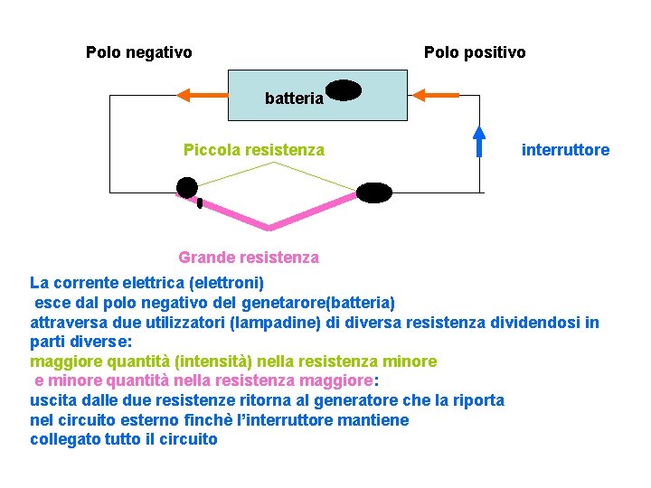 Polo negativo Polo positivo batteria Piccola resistenza interruttore Grande resistenza La corrente elettrica (elettroni) esce dal polo negativo del genetarore(batteria) attraversa due utilizzatori (lampadine) di diversa resistenza dividendosi in parti diverse: maggiore quantità (intensità) nella resistenza minore e minore quantità nella resistenza maggiore: uscita dalle due resistenze ritorna al generatore che la riporta nel circuito esterno finchè l’interruttore mantiene collegato tutto il circuito
