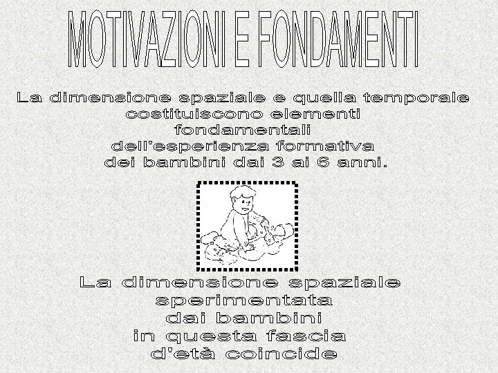 LA METODOLOGIA Fermo restando che lo sviluppo cognitivo parte da una base percettiva, motoria e manipolativa rimane fondamentale l’importanza del GIOCO in tutte le sue forme ed espressioni: il GIOCO SIMBOLICO (di finzione, di immaginazione, di identificazione…). Il GIOCO SIMBOLICO, quello classico “Facciamo finta di…” è il gioco di finzione nel quale-secondo Piaget- il bambino manifesta, si esprime ed entra in relazione con gli altri, gli oggetti e con lo SPAZIO. Tale pensiero, si rivela ad esempio, quando il bambino “trasforma”una sedia capovolta o uno scatolone in una automobile. Nel gioco simbolico il bambino rappresenta la realtà così come gli piace e non come la vede oggettivamente e nel rapporto con gli oggetti assume un ruolo creativo-attivo-interpretativo(“Questo oggetto sembra. . . ”)