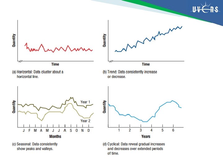 � Pengamatan berulang terhadap permintaan layanan dan produk berdasarkan urutan kejadian akan membentuk pola yang disebut sebagai time series. � Ada 5 pola dasar untuk time series permintaan: 1. Horizontal. Perubahan data di sekitar rata 2 konstan. 2. Trend. Peningkatan atau penurunan sistematis dalam series rata 2 sepanjang waktu. 3. Seasonal. Pola berulang untuk kenaikan dan pengurangan pada permintaan, tergantung waktu harian, mingguan, bulanan, atau musiman. 4. Cyclical. Peningkatan atau penurunan gradual pada permintan yang sulit diprediksi dalam jangka waktu panjang (tahuan atau dekade). 5. Random. Variasi permintan yang tidak dapat diramalkan.