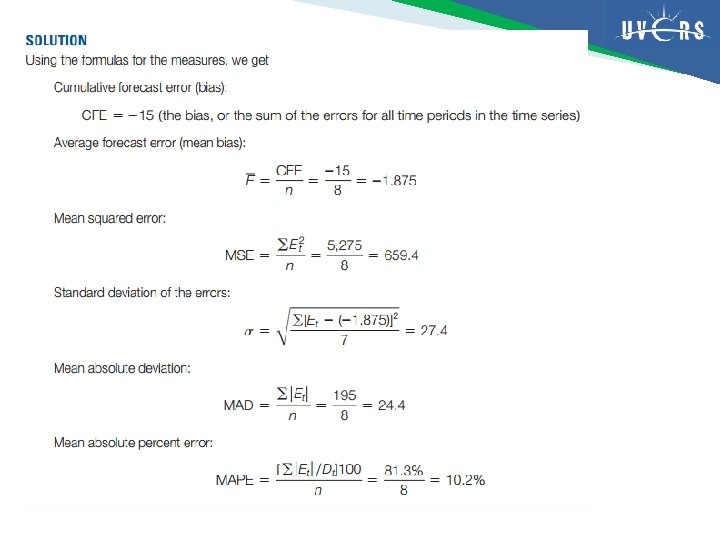 Contoh #1 Tabel berikut berisi penjualan aktual kursi goyang dan peramalan yang dibuat untuk 8 bulan terkahir. � Hitunglah CFE, MSE, , MAD, dan MAPE untuk produk ini.