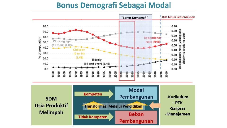 Kontribusi Pendidikan Vokasi Terhadap Struktur Tenaga Kerja Indonesia. . pengembangan pendidikan vokasi adalah amanah Nawa Cita dan sekaligus memenuhi target Sustainable Development Goals (SDG)…. WAJAR 9 TH 1994 WAJAR 12 TH 2016 Struktur tenaga kerja Indonesia BONUS DEMOGRAFI (2010 – 2040) 65% Usia kerja Pendidikan 2010 2014 2030 ≥ S 1/D 4 (%) 4 7 15 Diplomas (%) 2 3 11 SMK (%) 8 10 21 SMA (%) 14 17 20 SMP (%) 19 18 13 ≤ SD (%) 49 45 20 predict ed . . kami akan membangun sejumlah Science dan Techno Park di daerah-daerah, politeknik dan SMK-SMK dengan prasarana dan sarana dengan teknologi terkini … terwujudnya Indonesia yang berdaulat, mandiri dan berkepribadian berlandaskan gotong royong to end poverty, protect the planet, and ensure prosperity for all By 2030, substantially increase the number of youth and adults who have relevant skills, including technical and vocational skills, for employment, decent jobs and entrepreneurship… 21