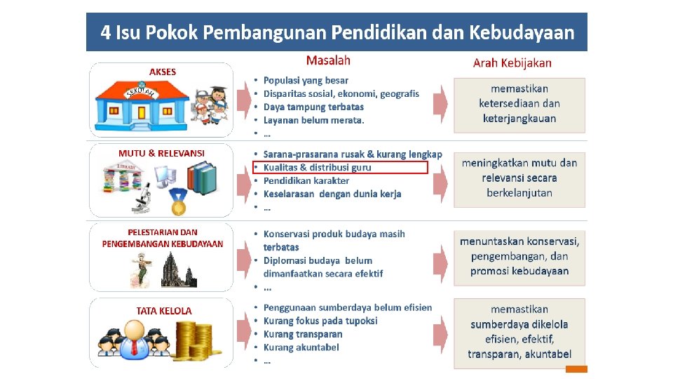 U. N. Sustainable Development Goals 2015 -2030 Vs Visi Kemdikbud UN SDG 2015 -2030 • By 2030 all governments ensure that all learners are taught by qualified, professionallytrained, motivated and well-supported teachers. Visi Kemdikbud • Terbentuknya insan serta ekosistem Pendidikan dan Kebudayaan yang berkarakter dengan dilandasi semangat gotong royong