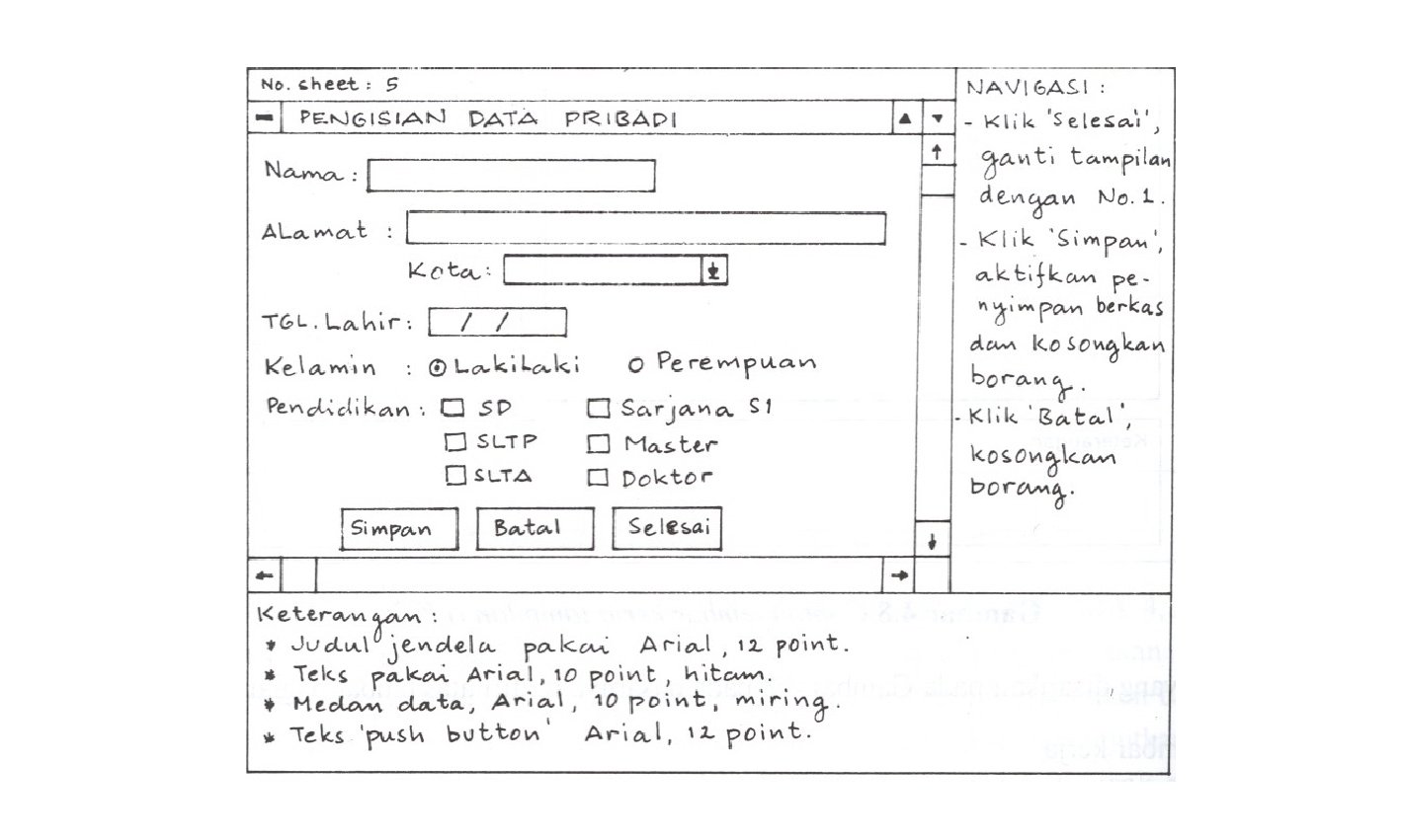 Pembuatan LKT • Lembar Kerja Tampilan (screen design worksheet) 1. 2. 3. 4. No : Nomor Lembar Kerja Tampilan : berisi sketsa tampilan yang akan muncul Navigasi : kapan tampilan akan muncul, kapan berubah menjadi tampilan lain. Keterangan : penjelasan singkat tentang atribut yang akan dipakai