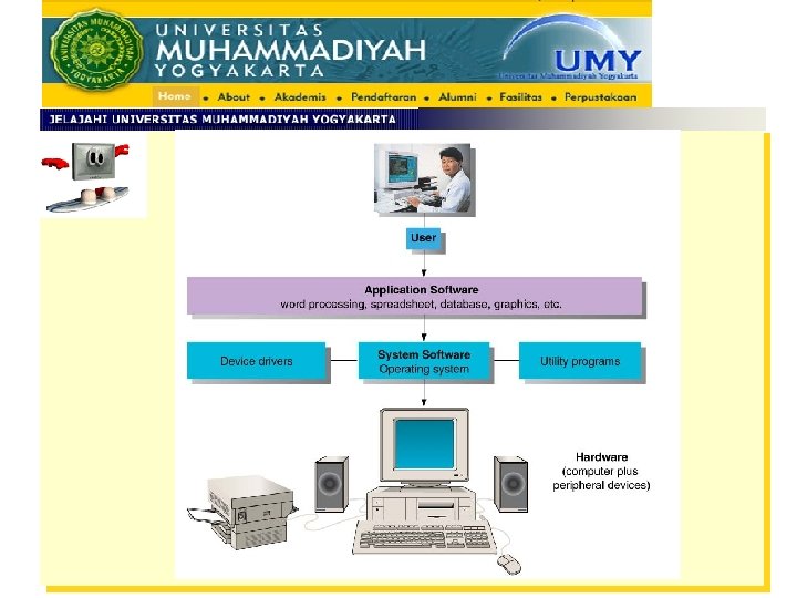 Perangkat lunak sistem v Perangkat lunak sistem merupakan kumpulan program - termasuk program sistem operasi (Windows dan Mac OS) - yang mengatur dan mengkoordinasi perangkat keras komputer. v Perangkat lunak sistem bekerja seperti sistem saraf manusia yaitu menjaga bekerjanya organ-organ vital dan mengkoordinasi aktivitasnya. v Perangkat lunak sistem mengelola dan mengkoordinasi perangkat keras komputer pada saat kita bekerja menggunakan perangkat lunak aplikasi. v Perangkat lunak sistem terdiri dari tiga tipe program 1. Program utilitas (Utilities) 2. Program pengendali perangkat (Device driver) 3. Program penerjemah bahasa (Language Translator)