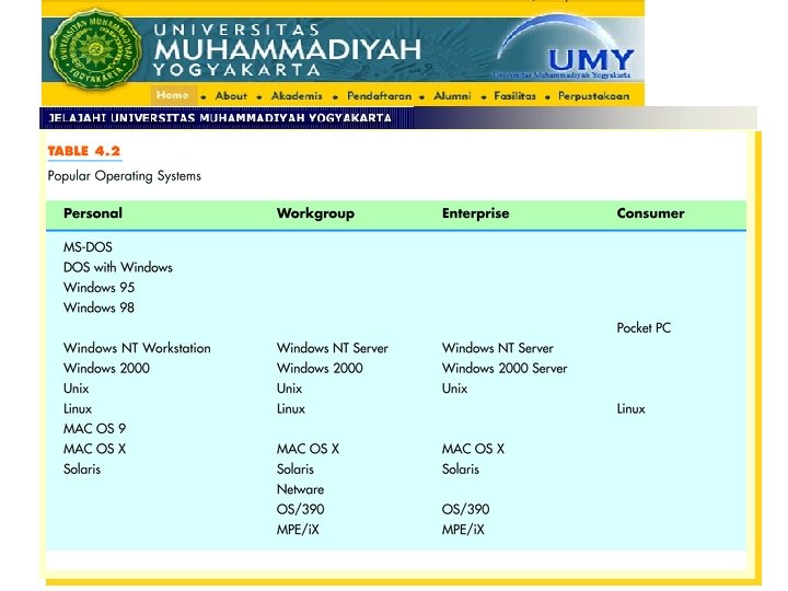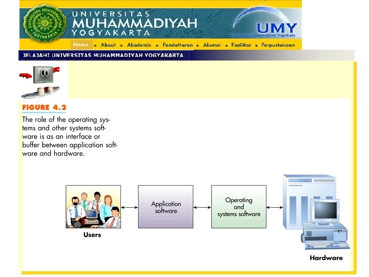 Sistem Operasi v Semua komputer mempunyai perangkat lunak sistem operasi (OS) yang mempunyai tiga tujuan penting yaitu menjalankan aplikasi, mengkoordinasi perangkat keras dan menyediakan fasilitas antar muka bagi pengguna (user interface). v Fungsi utama adalah mengkoordinasi dan mengendalikan perintah masuk dan keluar ke dan dari tempat tertentu. Misalnya, OS memulai komputer kemudian menampilkan grafik antar muka, sehingga kita dapat berinteraksi, menjalankan dan mengendalikan aplikasi.