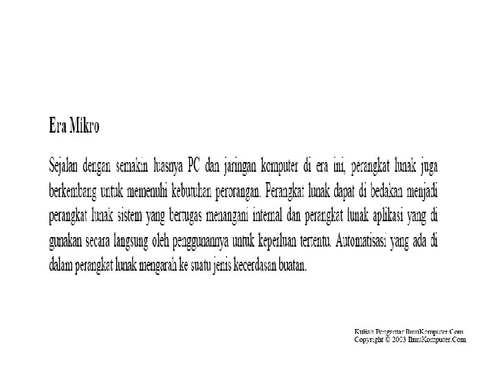 Perangkat Lunak • Merupakan program yang diperlukan untuk menjalankan perangkat keras komputer. • Perangkat lunak dapat digolongkan menjadi tiga bagian, yaitu:
