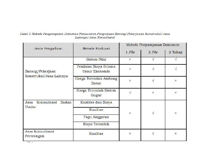 EVALUASI KUALIFIKASI, PENETAPAN DAN PENGUMUMAN HASIL KUALIFIKASI Evaluasi Dokumen Kualifikasi berdasarkan Formulir Isian Kualifikasi, terdiri dari: 1. Barang/jasa lainnya/ konstruksi : Evaluasi persyaratan evaluasi administrasi/ legalitas dan evaluasi kualifikasi teknis dilakukan dengan sistem gugur 2. Jasa Konsultansi : a) Pasca kualifikasi : Evaluasi persyaratan administrasi kualifikasi dilakukan dengan sistem gugur b) Pada pelaksanaan Prakualifikasi : 1. Evaluasi persyaratan administrasi/legalitas dilakukan dengan sistem gugur 2. Evaluasi persyaratan teknis kualifikasi dilakukan dengan sistem nilai/pembobotan 3. Hasil evaluasi persyaratan teknis sebagai dasar untuk menyusun calon daftar pendek