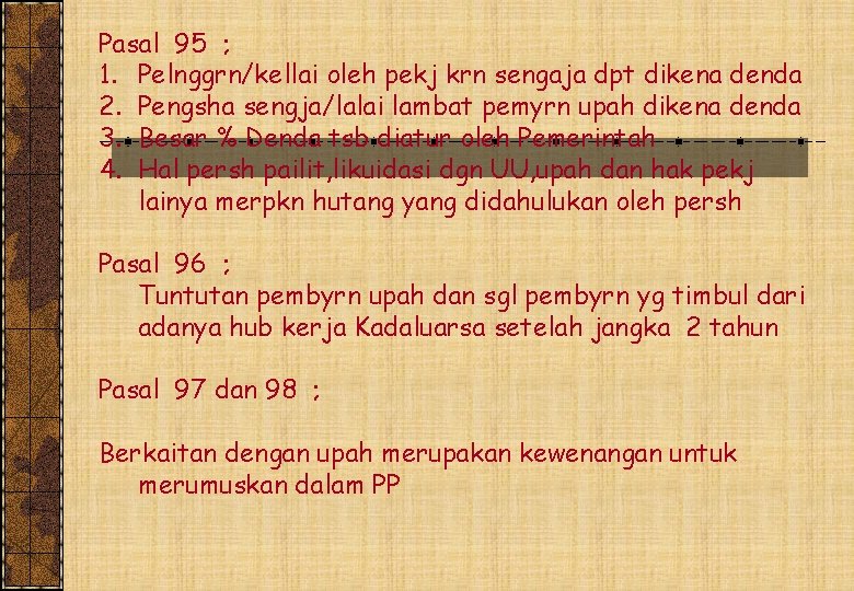 Pasal 95 ; 1. Pelnggrn/kellai oleh pekj krn sengaja dpt dikena denda 2. Pengsha sengja/lalai lambat pemyrn upah dikena denda 3. Besar % Denda tsb diatur oleh Pemerintah 4. Hal persh pailit, likuidasi dgn UU, upah dan hak pekj lainya merpkn hutang yang didahulukan oleh persh Pasal 96 ; Tuntutan pembyrn upah dan sgl pembyrn yg timbul dari adanya hub kerja Kadaluarsa setelah jangka 2 tahun Pasal 97 dan 98 ; Berkaitan dengan upah merupakan kewenangan untuk merumuskan dalam PP