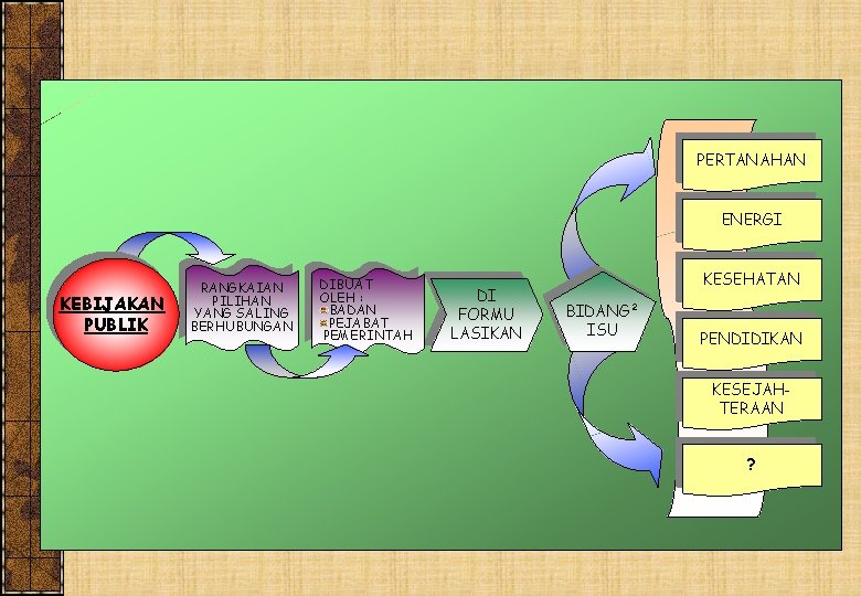 PERTANAHAN ENERGI KEBIJAKAN PUBLIK RANGKAIAN PILIHAN YANG SALING BERHUBUNGAN DIBUAT OLEH : BADAN PEJABAT PEMERINTAH DI FORMU LASIKAN KESEHATAN BIDANG² ISU PENDIDIKAN KESEJAHTERAAN ?