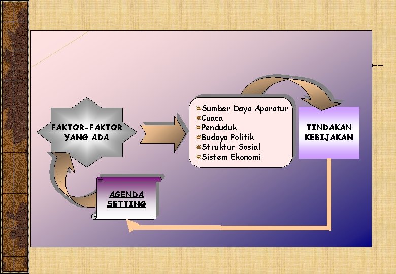 FAKTOR-FAKTOR YANG ADA AGENDA SETTING Sumber Daya Aparatur Cuaca Penduduk Budaya Politik Struktur Sosial Sistem Ekonomi TINDAKAN KEBIJAKAN