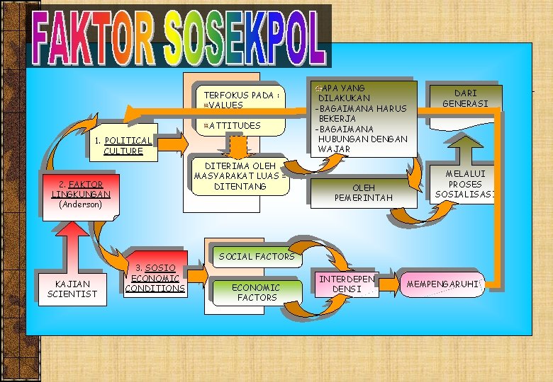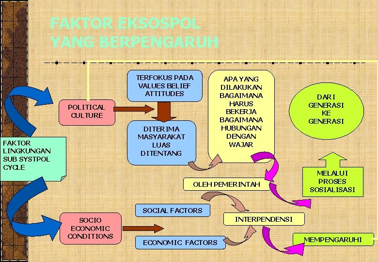 FAKTOR EKSOSPOL YANG BERPENGARUH TERFOKUS PADA VALUES BELIEF ATTITUDES APA YANG DILAKUKAN BAGAIMANA HARUS BEKERJA BAGAIMANA HUBUNGAN DENGAN WAJAR POLITICAL CULTURE DITERIMA MASYARAKAT LUAS DITENTANG FAKTOR LINGKUNGAN SUB SYSTPOL CYCLE OLEH PEMERINTAH DARI GENERASI KE GENERASI MELALUI PROSES SOSIALISASI SOCIAL FACTORS SOCIO ECONOMIC CONDITIONS INTERPENDENSI ECONOMIC FACTORS MEMPENGARUHI