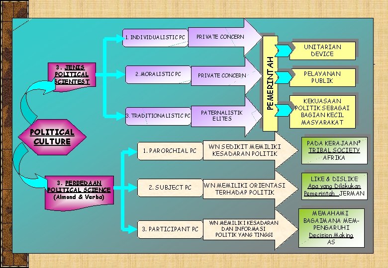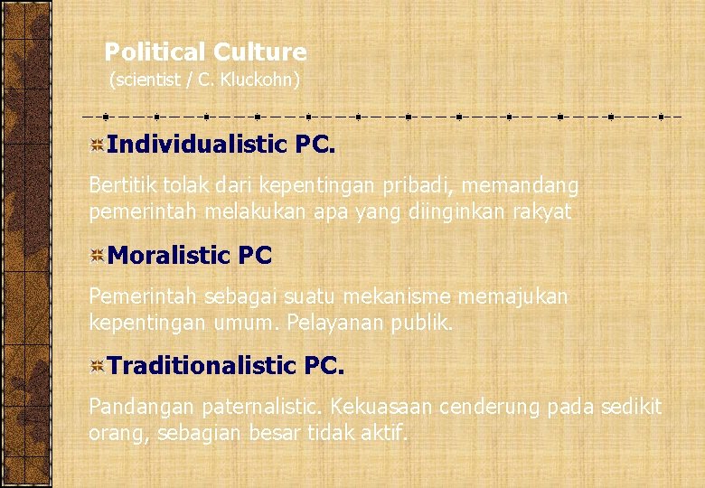 Political Culture (scientist / C. Kluckohn) Individualistic PC. Bertitik tolak dari kepentingan pribadi, memandang pemerintah melakukan apa yang diinginkan rakyat Moralistic PC Pemerintah sebagai suatu mekanisme memajukan kepentingan umum. Pelayanan publik. Traditionalistic PC. Pandangan paternalistic. Kekuasaan cenderung pada sedikit orang, sebagian besar tidak aktif.