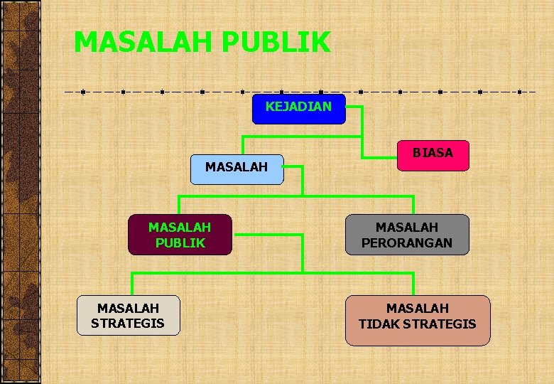 MASALAH PUBLIK KEJADIAN MASALAH PUBLIK MASALAH STRATEGIS BIASA MASALAH PERORANGAN MASALAH TIDAK STRATEGIS