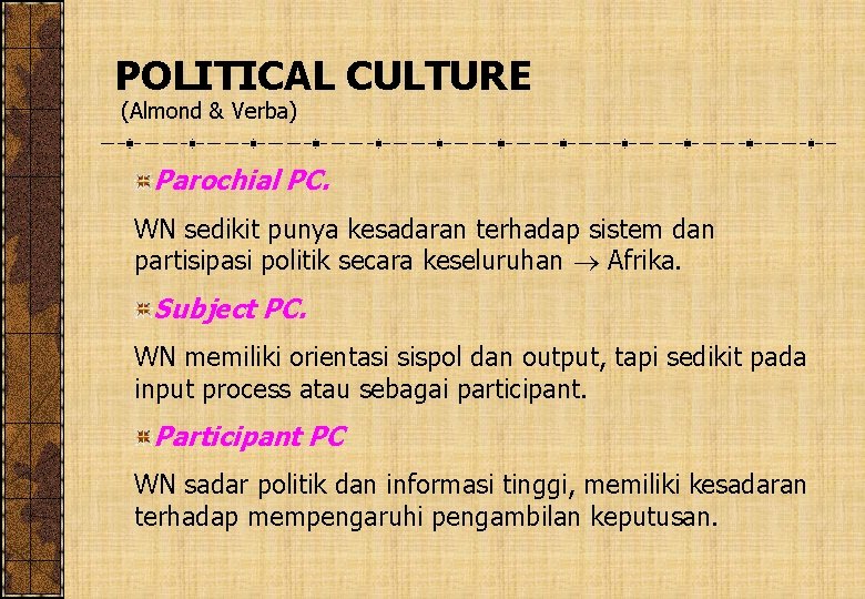 POLITICAL CULTURE (Almond & Verba) Parochial PC. WN sedikit punya kesadaran terhadap sistem dan partisipasi politik secara keseluruhan Afrika. Subject PC. WN memiliki orientasi sispol dan output, tapi sedikit pada input process atau sebagai participant. Participant PC WN sadar politik dan informasi tinggi, memiliki kesadaran terhadap mempengaruhi pengambilan keputusan.