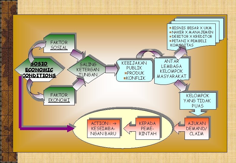 BISNIS BESAR X UKM NAKER X MANAJEMEN DEBITOR X KREDITOR PETANI X PEMBELI KOMODITAS FAKTOR SOSIAL SOSIO ECONOMIC CONDITIONS SALING KETERGAN TUNGAN KEBIJAKAN PUBLIK PRODUK KONFLIK FAKTOR EKONOMI ANTAR LEMBAGA KELOMPOK MASYARAKAT KELOMPOK YANG TIDAK PUAS ACTION : KESEIMBANGAN BARU KEPADA PEMERINTAH AJUKAN DEMAND/ CLAIM
