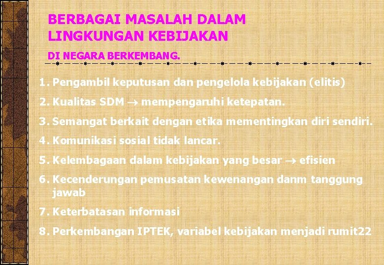 BERBAGAI MASALAH DALAM LINGKUNGAN KEBIJAKAN DI NEGARA BERKEMBANG. 1. Pengambil keputusan dan pengelola kebijakan (elitis) 2. Kualitas SDM mempengaruhi ketepatan. 3. Semangat berkait dengan etika mementingkan diri sendiri. 4. Komunikasi sosial tidak lancar. 5. Kelembagaan dalam kebijakan yang besar efisien 6. Kecenderungan pemusatan kewenangan danm tanggung jawab 7. Keterbatasan informasi 8. Perkembangan IPTEK, variabel kebijakan menjadi rumit 22