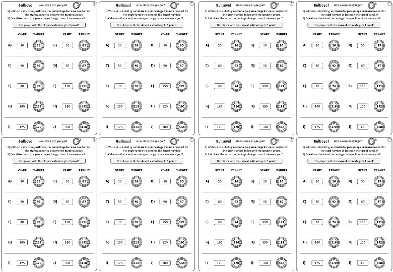 Bullseye! ① How close can you get? 1) Without calculating, estimate the percentage increase needed for the start number to become the target number. 2) Calculate the actual percentage change: how close were you? The player with the closest estimate gets 1 point! Start target A) 20 26 C) 80 E) Start target B) 50 85 A) 20 26 B) 50 85 92 D) 60 87 C) 80 92 D) 60 87 40 74 F) 150 171 E) 40 74 F) 150 171 G) 160 216 H) 120 192 I) 125 170 J) 300 468