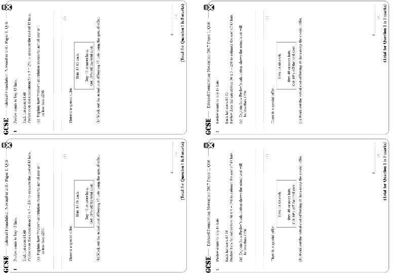 GCSE 1 Edexcel Foundation: November 2017 Paper 1, Q 16 Pavlov wants to buy 45 hats. Each hat costs £ 4. 60 Pavlov does the calculation 50 x 5 = 250 to estimate the cost of 45 hats. (a) Explain how Pavlov’s calculation shows the actual cost will be less than £ 250. (1) There is a special offer. Hats £ 4. 60 each. Buy 40 or more hats, Get 10% off the total cost. (b) Work out the actual cost of buying 45 hats using the special offer. £ (4) (Total for Question 1 is 5 marks)