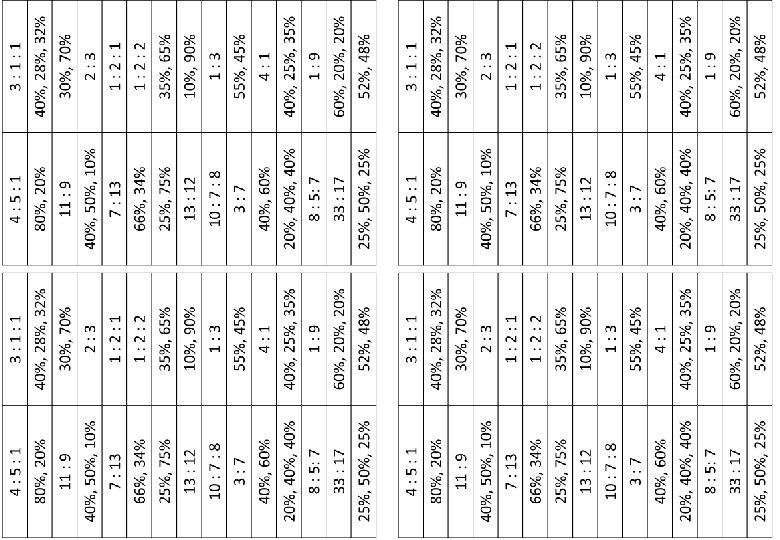 4: 5: 1 80%, 20% 11 : 9 40%, 50%, 10% 3: 1: 1 40%, 28%, 32% 30%, 70% 2: 3 7 : 13 66%, 34% 25%, 75% 1: 2: 1 1: 2: 2 35%, 65% 13 : 12 10 : 7 : 8 3: 7 40%, 60% 20%, 40%, 40% 8 : 5: 7 33 : 17 10%, 90% 1: 3 55%, 45% 4: 1 40%, 25%, 35% 1: 9 60%, 20%, 20% 25%, 50%, 25% 52%, 48%