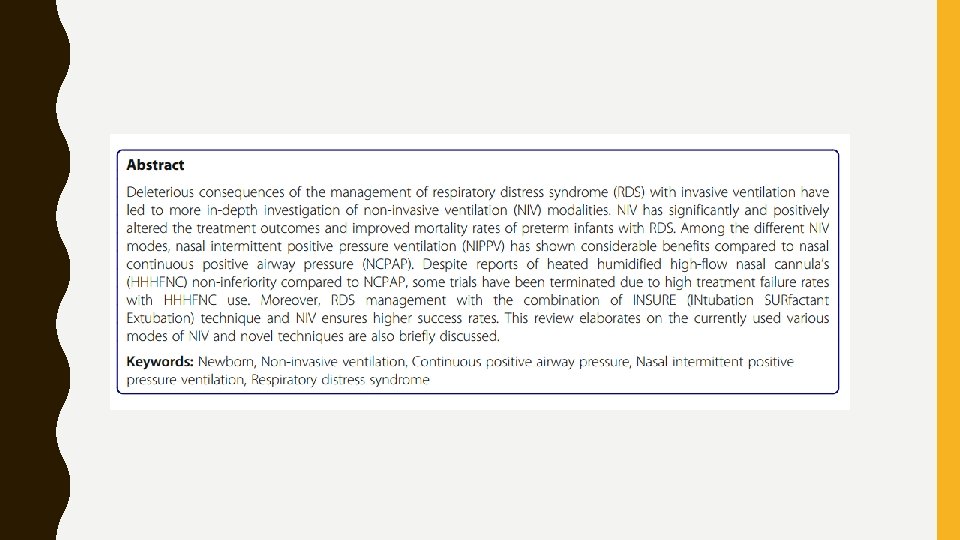 CONCLUSÃO ü Na busca pela abordagem ideal de VNI para o suporte respiratório bem-sucedido no manejo da SDR e na prevenção da DBP, ainda são necessárias mais pesquisas e estudos ü O NIPPV está substituindo rapidamente o CPAPn por seus benefícios notáveis ü NAVA, n. HFOV e NIPPV são intervenções promissoras, mas requerem ECRs maiores para confirmar sua segurança e eficácia em vários grupos de bebês, em comparação com os modos mais familiares da VNI