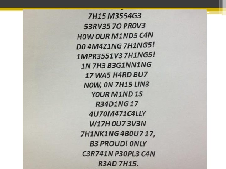 The human brain tries to find patterns and ways to organize information. Consider: • Aoccdrnig to a rscheearch at an Elingsh uinervtisy, it deosn't mttaer in waht oredr the ltteers in a wrod are, the olny iprmoatnt tihng is taht frist and lsat ltteer is at the rghit pclae. The rset can be a toatl mses and you can sitll raed it wouthit porbelm. Tihs is bcuseae we do not raed ervey lteter by it slef but the wrod as a wlohe.