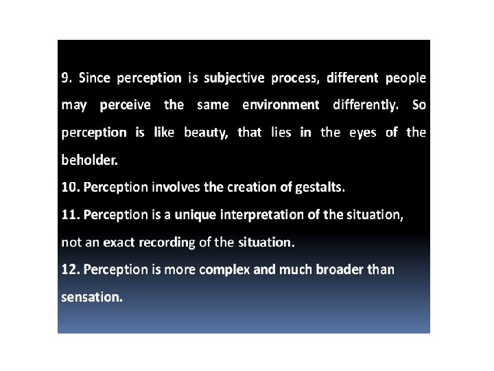 Various External and Internal factors affect our selection process: 1. (a) (b) (c) (d) (e) (f) (g) (h) EXTERNAL FACTORS Intensity Size Contrast Motion Repetition Novelty & Familiarity Status Nature 2. INTERNAL FACTORS (a) Learning (b) Motivation (c) Personality