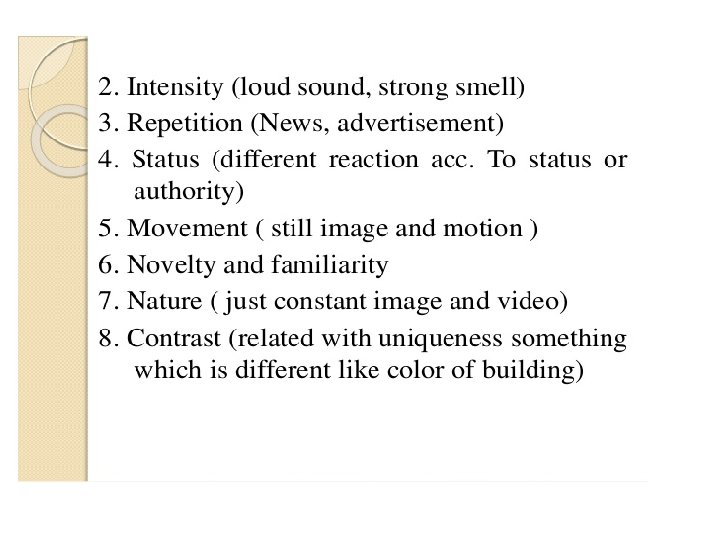 7. Status- Orders given by high status/ low status people are perceived differently. 8. Nature- Whether the object is visual/ auditory, picture/ words, video/ still pictures attract different levels of attention.