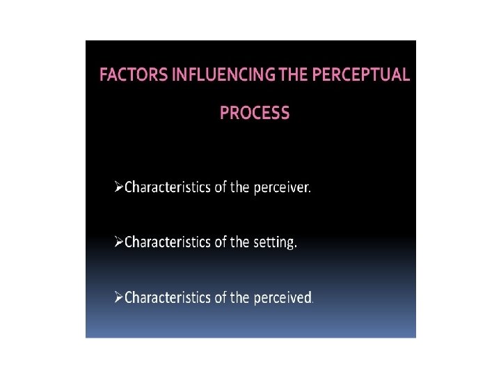 1. CHARACTERISTICS OF THE PERCEIVER 1. 2. 3. 4. 5. 6. 7. 8. Needs and Motives Self Control Past Experience Current psychological state Beliefs Expectations Situation Cultural Upbringing