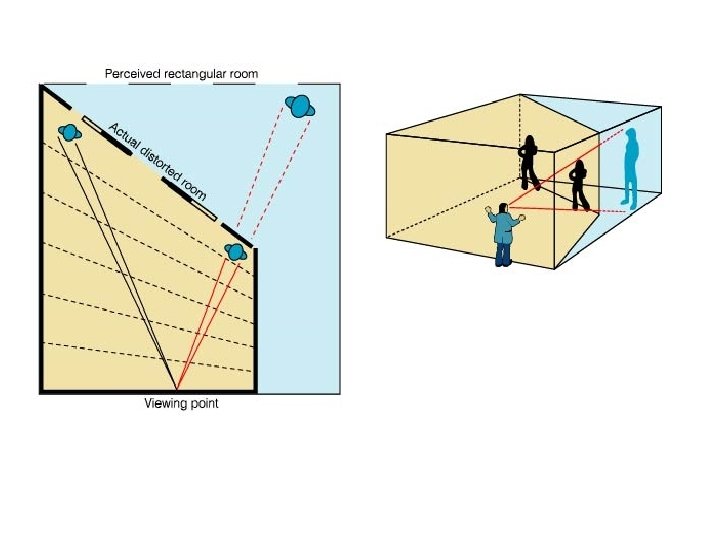 Accommodation is evident in the Ames Room because the lens is adjusting to accommodate short and long distances – people in the room are moving towards the subject, not along the straight wall. Room is two illusions: Room appears cubic when viewed monocularly through the peep hole. Room is actually trapezoidal. Floor is inclined/walls slanted but appear perpendicular Constancies Size – person walks along slanted wall, getting closer and closer to observer therefore gets larger in relation to the room. Shape – regularity of familiar objects (clocks) – all distorted – illusion Secondary depth cues Relative size – of the people compared to the room – people grow and shrink Conflict between relative size and size constancy contributes to the illusion in the Ames Room Hypothesis testing – check with schema already present then acted on by top down processes Top Down Culture – western culture familiar with vertical and horizontal lines Motivation – highly motivated to make the room make sense Past experience Mostly Bottom Up but some top Down – Analysis by Synthesis.