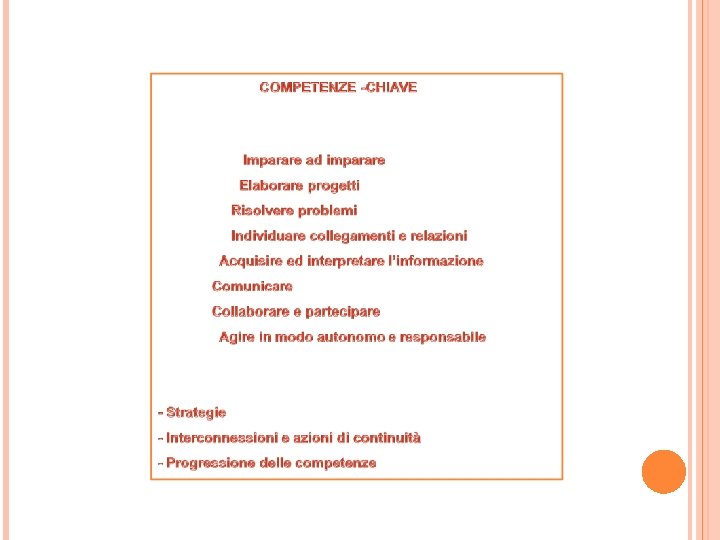Memorizzare regole, procedure, linguaggi specifici, strutture cognitive per ricordare, ripetere, riprovare, rielaborare, rileggere, riutilizzare procedure metodologiche proprie delle aree disciplinari Integrare le conoscenze: approfondire i concetti, costruirne mappe di sintesi, trasferire le conoscenze in contesti diversi Rielaborazione dei concetti secondo criteri di astrazione logico-deduttivi Autonomia di sistemazione e integrazione degli strumenti cognitivi (costruzione di modelli, mappe concettuali da utilizzare in situazioni simili e diverse. Vedi anche competenza “Individuare collegamenti e relazioni” ) Memorizzazione di regole, procedure, ecc. . . in funzione di percorsi ulteriori Padronanza nella capacità di operare sintesi: cogliere autonomamente nessi e relazioni complesse (vedi anche competenza “Individuare collegamenti e relazioni”) Consapevolezza del proprio percorso di apprendimento Consapevolezza dei propri tempi e stili di apprendimento Autonomia nella ricerca di fonti e materiali funzionali al proprio percorso Studio personale per memorizzare ed approfondire Valutazioni autonome ed approfondite