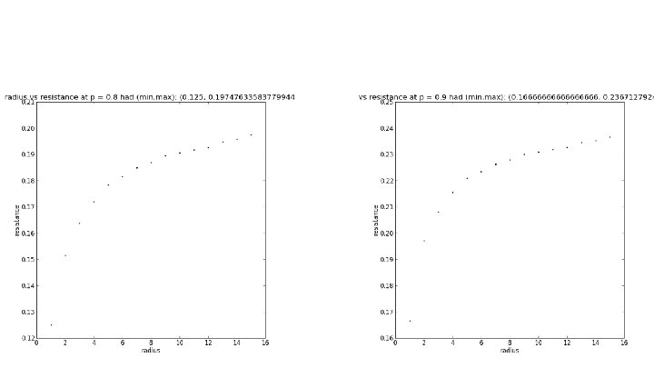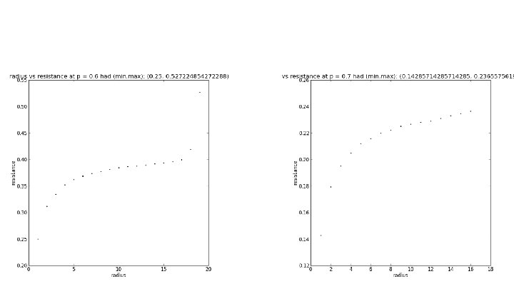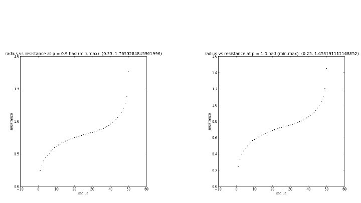 Max Clusters as Electrical Networks We can also model our graphs as electrical networks in order to determine if they are (by nature) recurrent or transient graphs. To do this on our finite graph approximations, we fix a vertex x and call it the origin set up a boundary consisting of vertices a distance r away from x. We give x a voltage of 1 and everything at and beyond the boundary a voltage of 0. The other voltages can be obtained via a system of equations. As we increase r, we take note of the resulting effective resistance Plotting r vs Reff, we would say the graph is recurrent if Reff goes to infinity and transient if it stays bounded. In this model, graph edges with source/target pairs (x, y) are resistors with resistance R(x, y) = 1 / Ε(u) where Ε(u) is the graph energy Ε(u) = ∑a~b(u(a) - u(b))2.