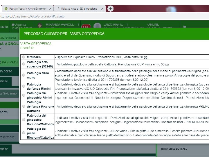 Patologia del ginocchio di pertinenza chirurgica Rimini: prenot. telef. diretta al 0541 -705358, lun-ven 8. 30 -12. 00; Riccione: prenotazione CUP (con la visita si attiverà la presa in carico del pz per l’eventuale percorso chirurgico). Indicare motivo visita tra i seguenti: deviazioni assiali (ginocchio valgo o varo), artrosi primitive o secondarie, condropatie, lesioni meniscali, lesioni caspulo-legamentose, osteocondriti, neoplasie benigne, degenerazioni reumatiche, condrocalcinosi).