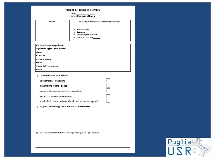 OSSERVAZIONE RECIPROCA Docente nel periodo di formazione e prova Cosa fa il docente in periodo di formazione e prova quando osserva il tutor? Prende nota degli elementi di qualità riscontrati nell’attività del tutor; individua o fa ipotesi sul meccanismo che li ha prodotti; annota domande da rivolgere al tutor; in seguito al confronto professionale che si instaura con il tutor, compie un’autovalutazione della propria azione didattica in termini di punti di forza e punti di debolezza e di livello di soddisfazione.