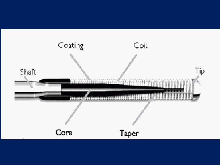 Guide wire - construction • Most - calibre of 0. 014 inch • Multi-layer constructions: 1. Core element (usually stainless steel/or nitinol): tapers at variable points towards wire tip to impart differential stiffness along wire's length 2. Terminal coil segment (often 30 mm length; usually radio -opaque material e. g. platinum/iridium alloys): gives flexibility and allows wire tip to be shaped per operator requirements 3. Coating: most wires – silicone/Teflon outer coating to aid easy advancement. Some coated with a hydrophilic polymer coating that becomes a gel when wet to reduce surface friction and increase wire ‘slipperiness’