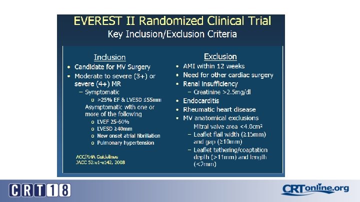 Primary (degenerative or DMR) vs. Secondary (functional or FMR) Mitral Regurgitation • • • Severe Primary MR Central jet > 40% of LA or holosystolic eccentric jet Vena contracta ≥ 0. 7 cm Regurgitant volume > 60 ml Regurgitant fraction ≥ 50% ERO ≥ 0. 40 cm 2 Angiographic grade 3 -4+ Severe Secondary MR (ACC 2014) • ERO > 0. 2 cm 2 • Regurgitant volume > 30 cc • Regurgitant fraction > 50% Severe Secondary MR (ACC 2017) • ERO ≥ 0. 40 cm 2 • Regurgitant volume > 60 ml JACC/AHA Valvular Heart Disease Guidelines. JACC (63). N 22. June 10 th 2014. Nishimura et al. J Am Coll Cardiol 2017; 70: 252– 89.