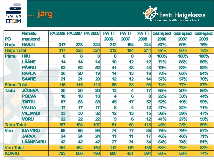 Perearsti tulemustasu (PA TT) 1. Osalejad 2006 -2007 - 2008 (13. 04. 08) 2. Tulemused 2006 – 2007 • • Esmased tulemused 2006 – 2007 Lõplikud tulemused 2006 ja prognoos 2007 3. Tulemuste võrdlus 2006 - 2007 • • • Ennetuse hõlmatus Krooniliste haigete jälgimise hõlmatus PA ravitöö tulemuslikkus 4. Kokku esmased tulemused 2007
