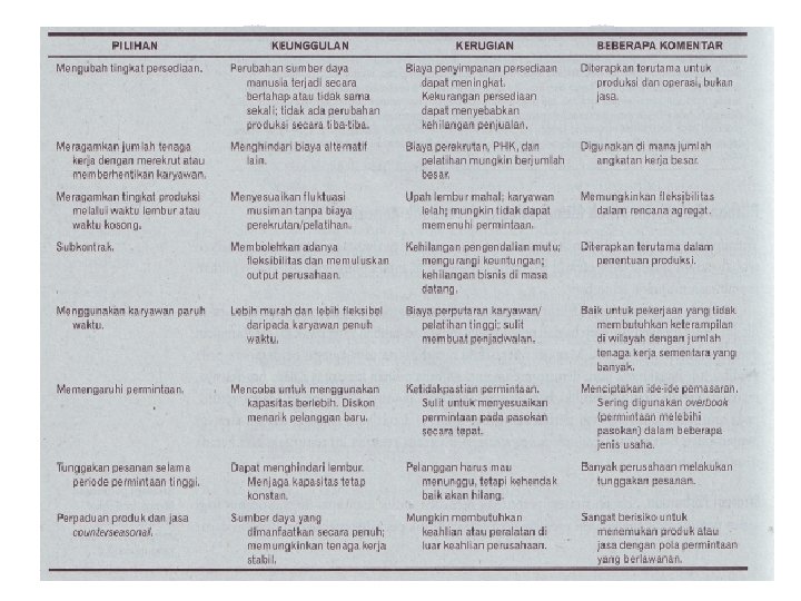 Pilihan Kapasitas l l l Mengubah tingkat persediaan. Meragamkan jumlah tenaga kerja dengan cara mengkaryakan atau memberhentikan. Meragamkan tingkat produksi melalui lembur atau waktu kosong. Subkontrak Penggunaan karyawan paruh waktu.