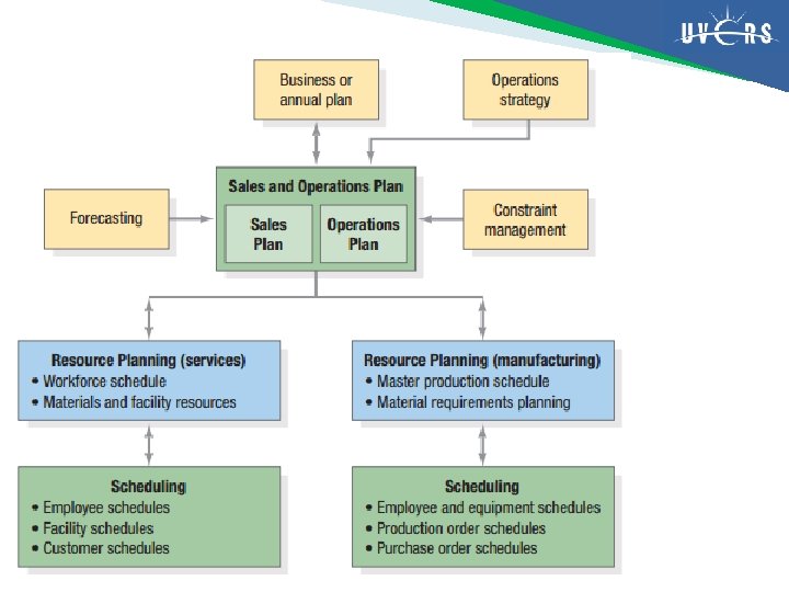 Perencanaan dan penjadwalan operasi (operations planning and scheduling) proses untuk memastikan bahwa rencana demand dan supply telah seimbang, mulai dari tingkat agregat hingga turun ke tingkat penjadwalan jangka pendek Fokus pada : 1) perencanaan penjualan (sales) dan operasi, 2) penjadwalan
