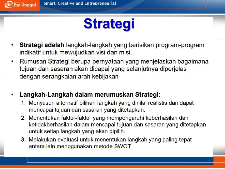 Contoh • Strategi: Perekrutan tenaga dokter spesialis – Kegiatan: Melakukan Job Analisis – Indikator: 5 Dokter baru yang terseleksi dalam rekrutmen