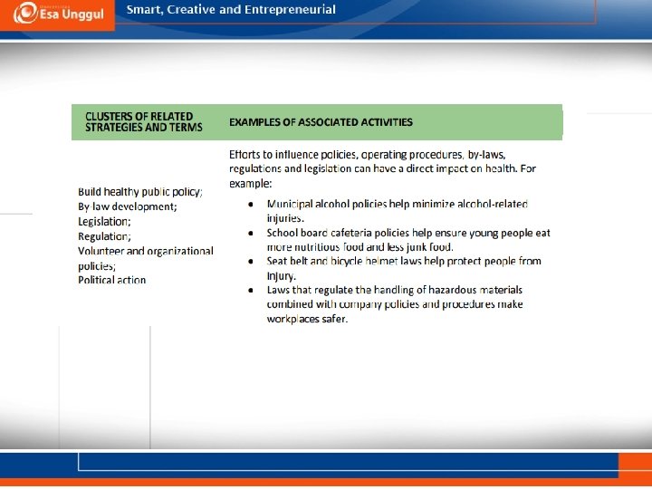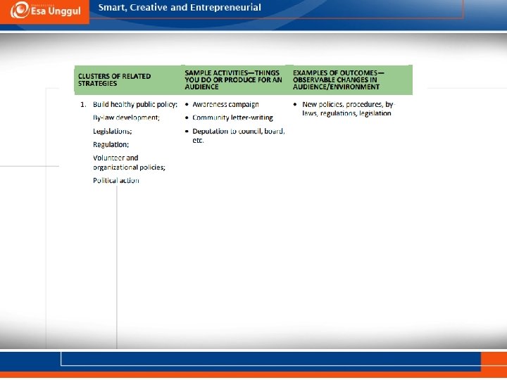 IDENTIFY STRATEGIES • A strategy is a broad approach to facilitating change. Choose strategies according to the results they are intended to create, or the typical activities they might include. • For instance, the Ottawa Charter for Health Promotion identifies five types of strategies: 1) build healthy public policy; 2) create supportive environments; 3) strengthen community action; 4) develop personal skills; and 5) reorient health services. A program can include one or more strategies. Each strategy contains one or more activities.