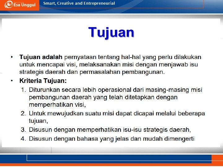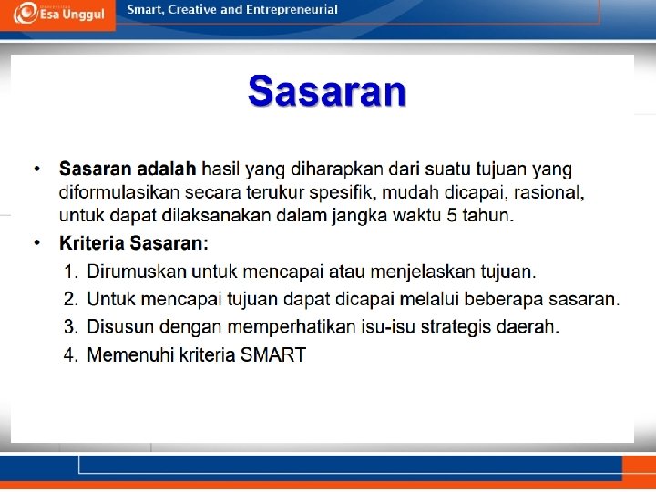 Contoh • Program: Peningakatan SDM di RS A Tahun 2018 • Tujuan: Meningkatkan SDM di RS A Tahun 2018 • Sasaran: – Meningkatkan jumlah SDM di RS A 20% dari sekarang pada Tahun 2018 – Meningkatkan kinerja SDM 90% di RS A pada Tahun 2018